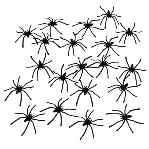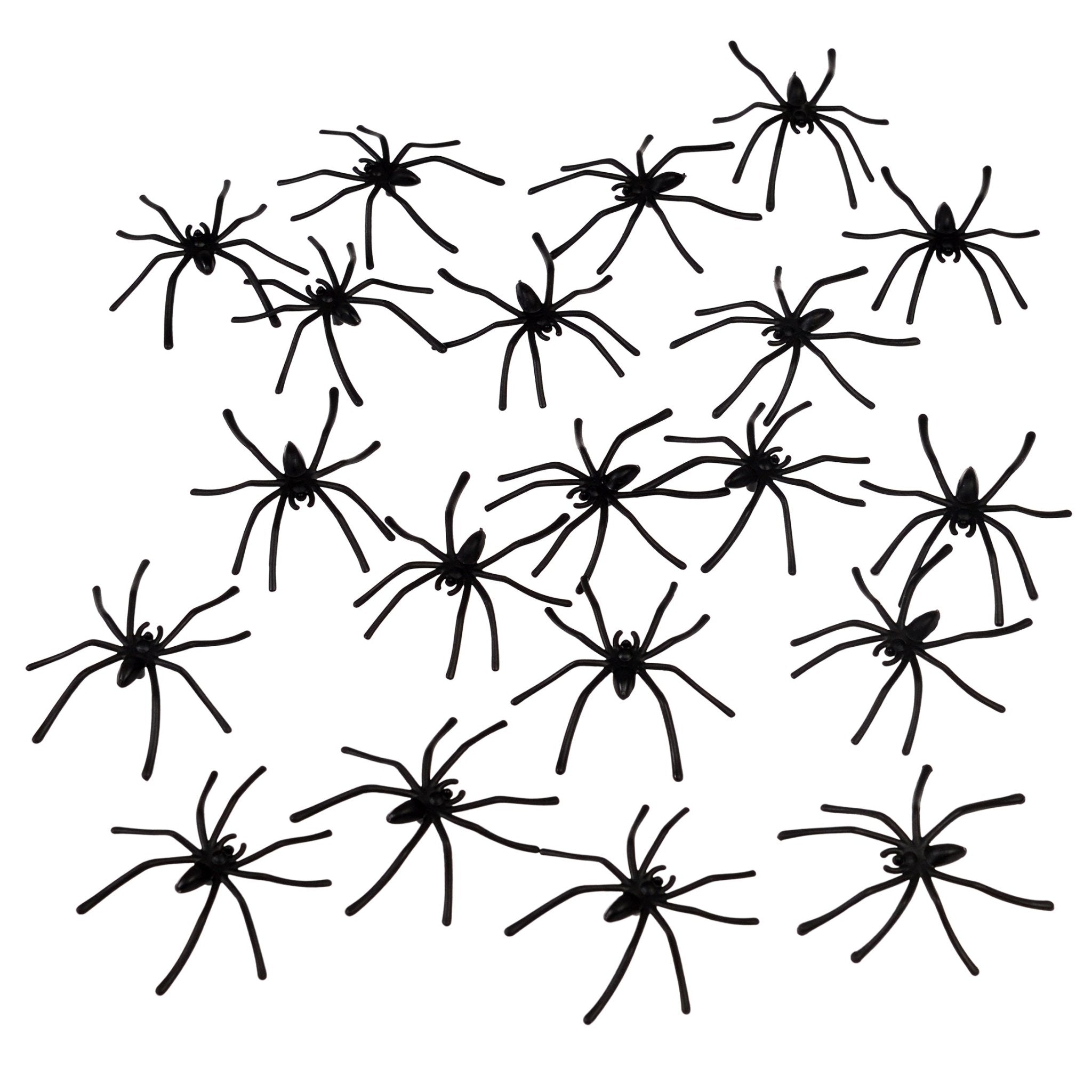 20 plain black plastic spiders in a box. Can be left around the house to scare family and friends, or used as halloween decorations!