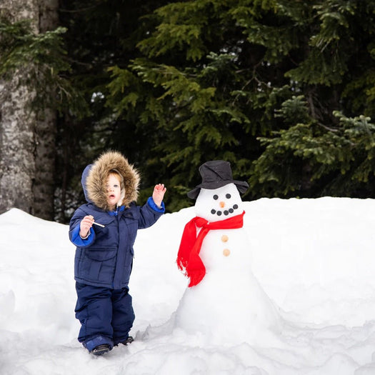 This DIY Snowman Kit includes one felt hat, one polyester scarf, one wood carrot nose, one wood pipe, two wood buttons, and seven pegs for eyes and mouth