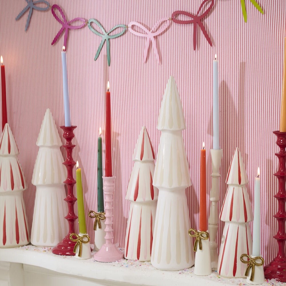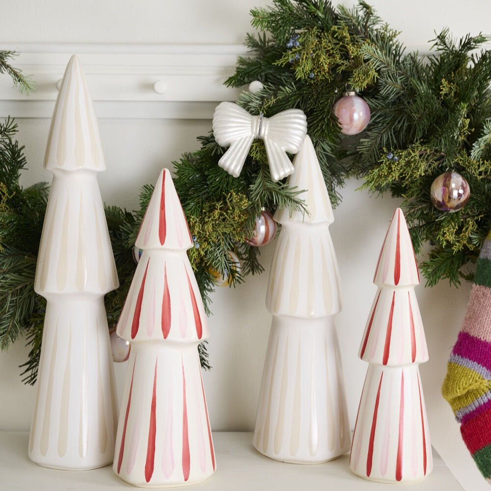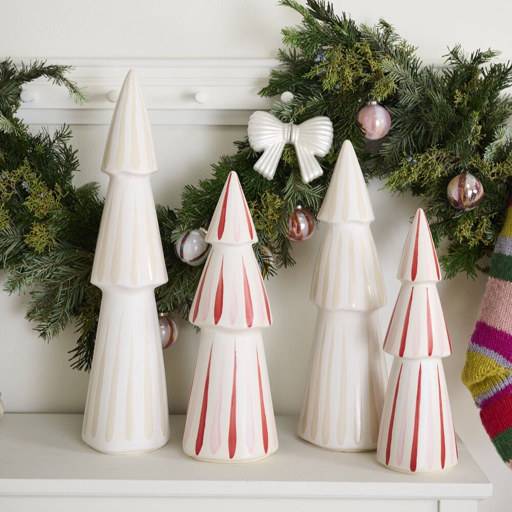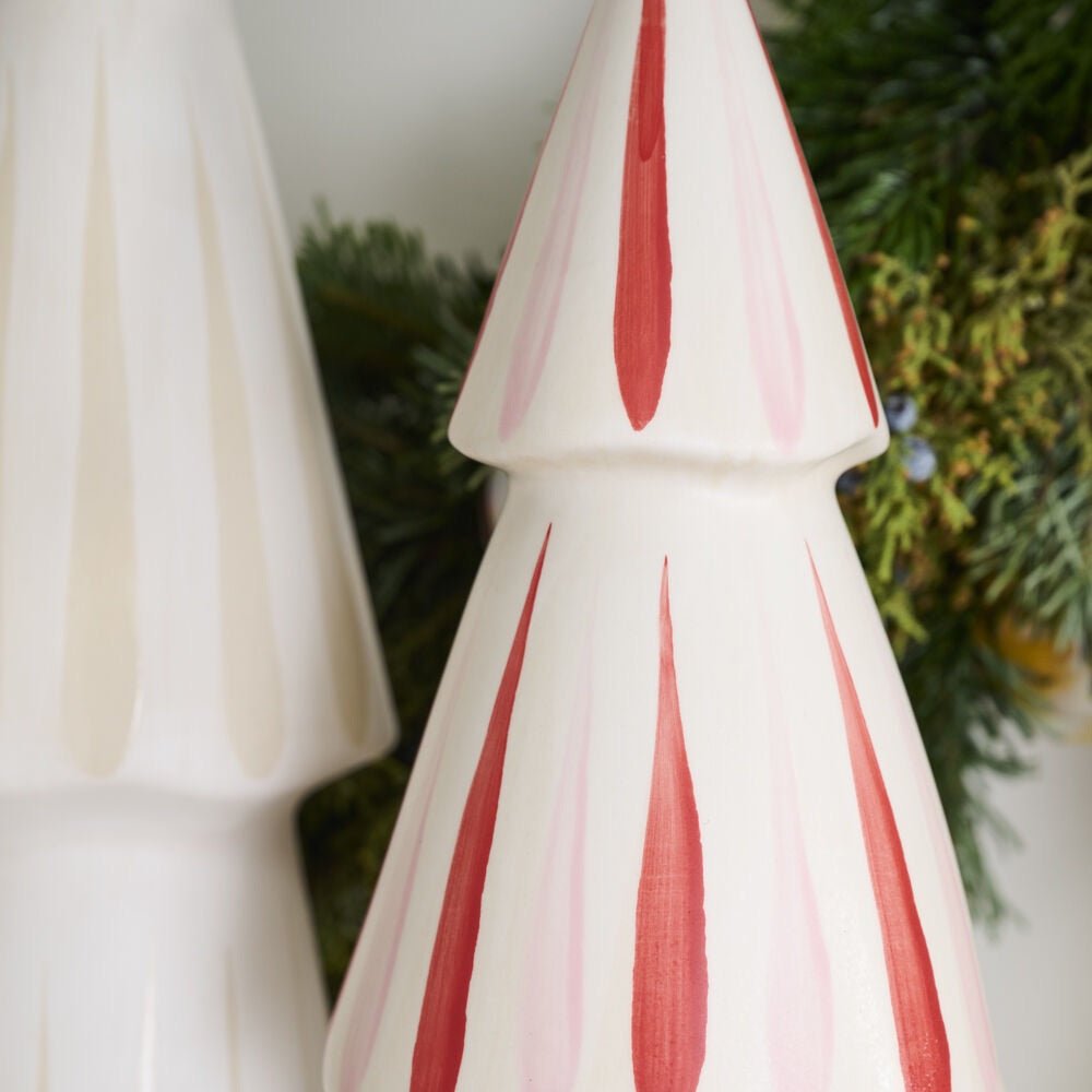 Create a warm, wintry scene with the Everwish Tree, a ceramic tree featuring a natural white clay base and vertical hand painted stripes in red and pink. The playful color & clean lines bring height to holiday presentations and make them easy to layer into any tablescape, mantle, or styled shelves, adding a touch of winter joy to your decor. Style both heights together for a fresh & modern holiday look.