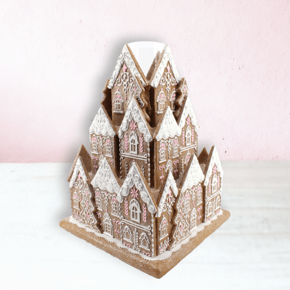 This Gingerbread village styled with frosted detailing, and pastel pink tones is a delightful seasonal addition to your home. Crafted by December Diamonds, this piece exemplifies commitment to unique seasonal decor. Intricately painted for a festive and collectible look with the built-in candle holder brightens windows and details for a magical Christmas display. Perfect display Size – A statement piece for mantels, shelves, or holiday tabletops.