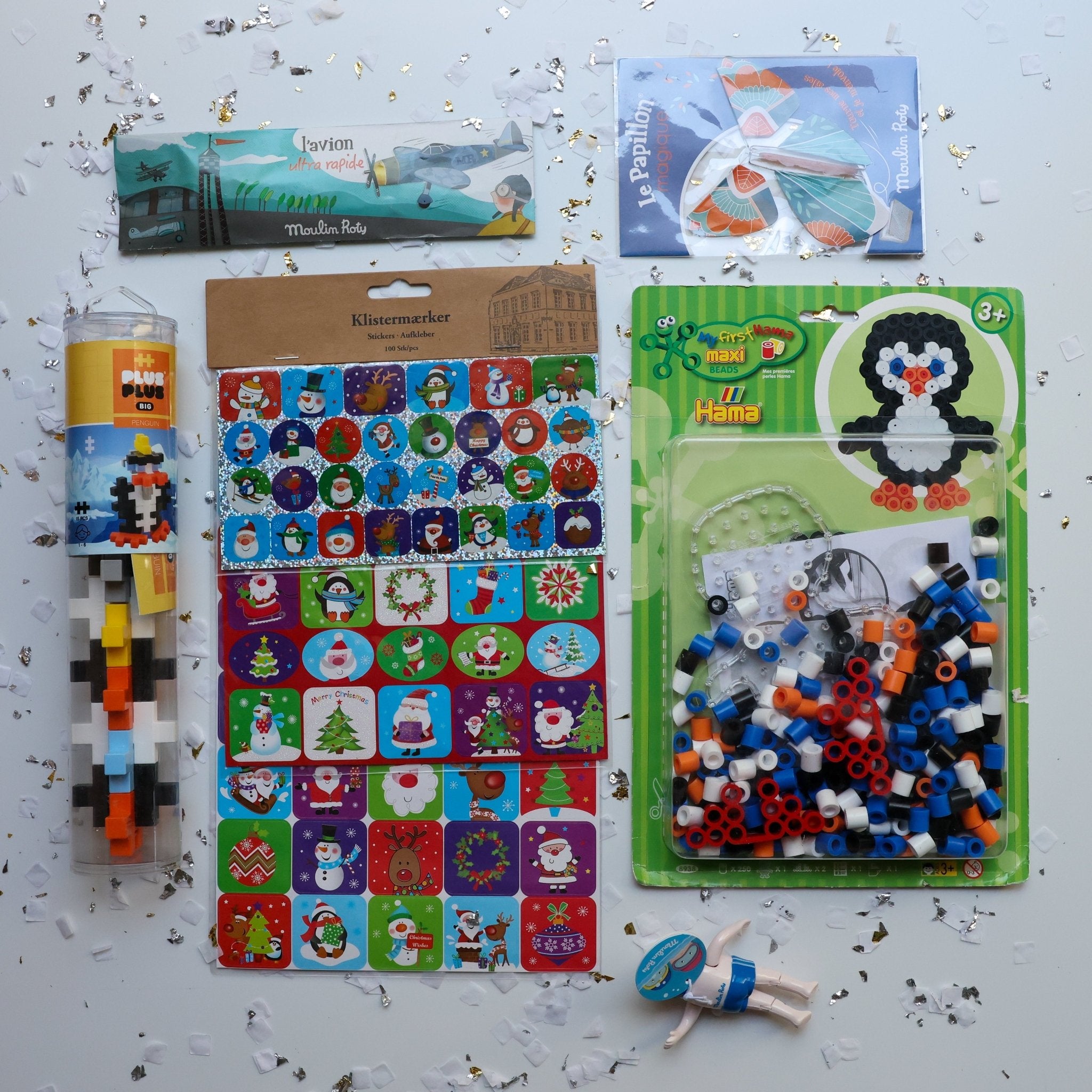 Spark imagination with this delightful stocking bundle packed with creative treasures for little ones. Inside you'll find colorful Christmas stickers, Hama beads and Plus Plus building toys to construct endless creations. Take the adventure outdoors with a charming plane and butterfly toy, perfect for imaginative play. Plus, splash-friendly bath and pool toys keep the fun going all year round. An ideal gift that combines crafting, building, and active play in one festive package.