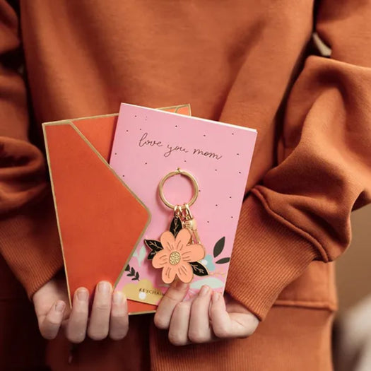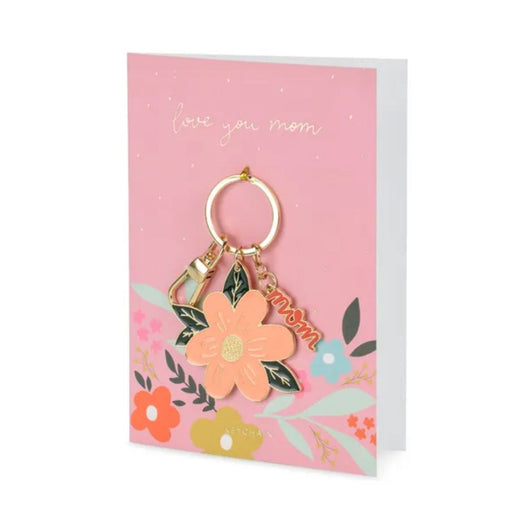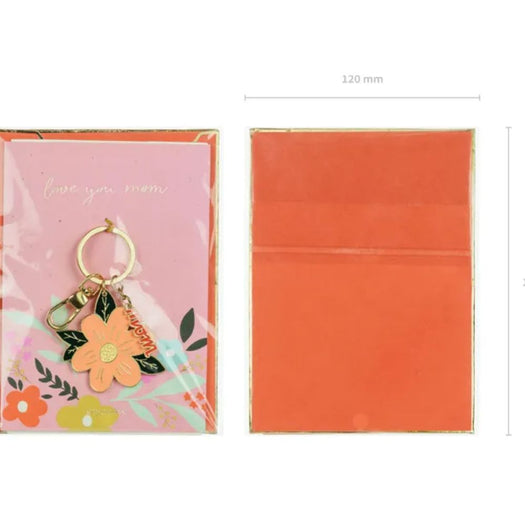 Card in pink colour with inscription ''Love you mom'', keychain in the shape of flower and red envelope