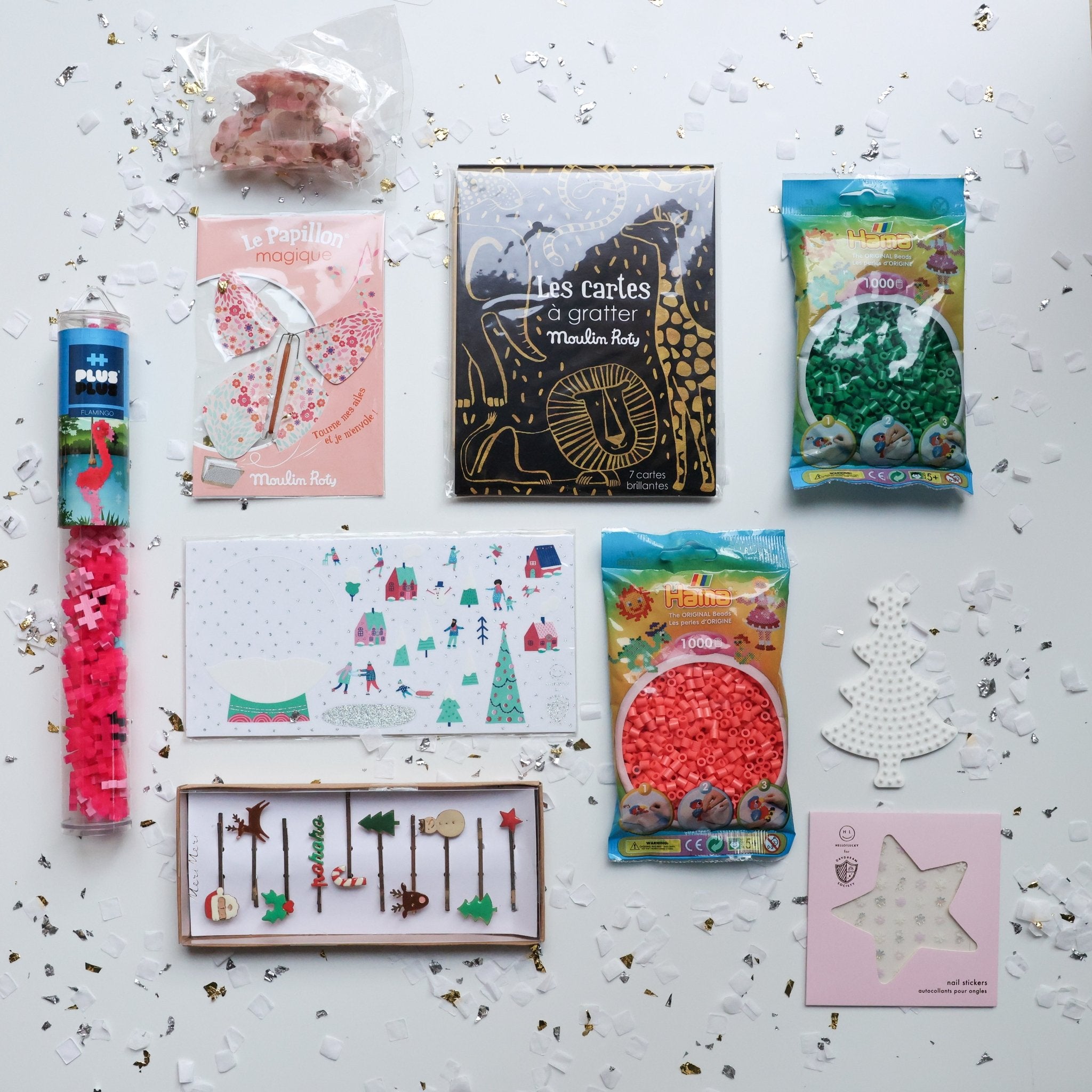 Sugarplum Dreams Stocking Fillers is a treasure trove of creative fun packed into one festive bundle. Dive into scratch card art, design with colorful Hama beads to craft Christmas tree ornaments or make personalized Christmas cards. Style your hair with an assortment of trendy clips, add sparkle with nail stickers, and explore endless possibilities with sticker crafting and a Plus Plus toy. A selection of toys rounds out this all-in-one gift that keeps kids entertained and inspired throughout the season.