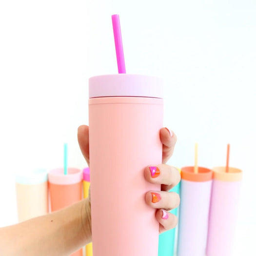Color blocking at its very best! These matte acrylic tumblers hold 16 ounces and come with a reusable straw. Use as is or add adhesive vinyl in your name or any pattern you like to customize the tumbler.