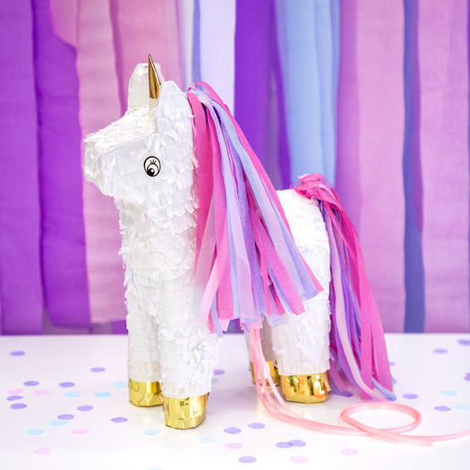 Add magic to your themed party by featuring this beautiful unicorn-shaped piñata. Covered in white fringe paper with pink, purple and gold accents. Fill with your favourite goodies.
