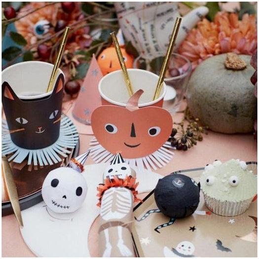 They feature 4 Halloween designs - a witch, skull, black cat and pumpkin, all with charming little hats with copper foil detail