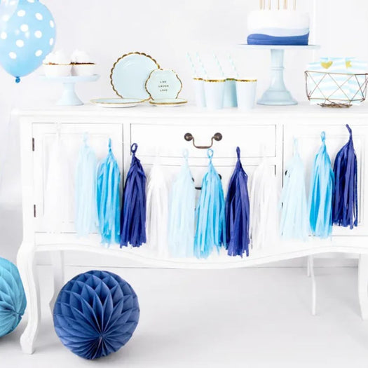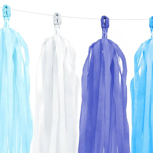 Set contains 12 tassels in white, blue, sky-blue, and navy blue (3 pcs each) and approx. 2 m of white twine