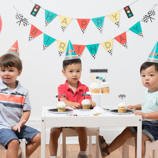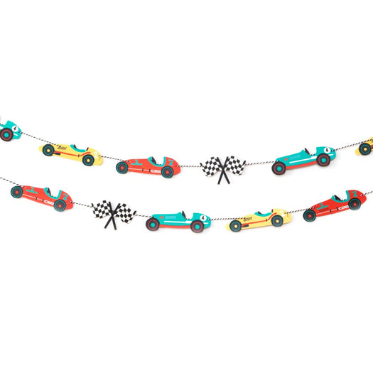 Create a race car scene with this garland. Featuring race cars in three different colors and checkered flags this garland will complete your race car party decorations. Great as a wall decor in a car lover's bedroom too.