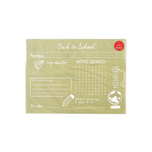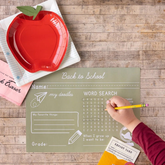 Create fun memories at your back to school celebrations with these green chalkboard placemats. Featuring a school themed word search and place to record favorite things, these placemats are perfect for back to school breakfasts, getting to know new classmates, or even after school activities!