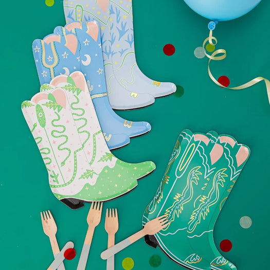 Calling all cowboys! Our "Yeehaw" collection has everything you need to gear up for your next rodeo. These cowboy boot plates feature blue and green patterns trimmed with gold foil details. This plate set includes 4 different designs.