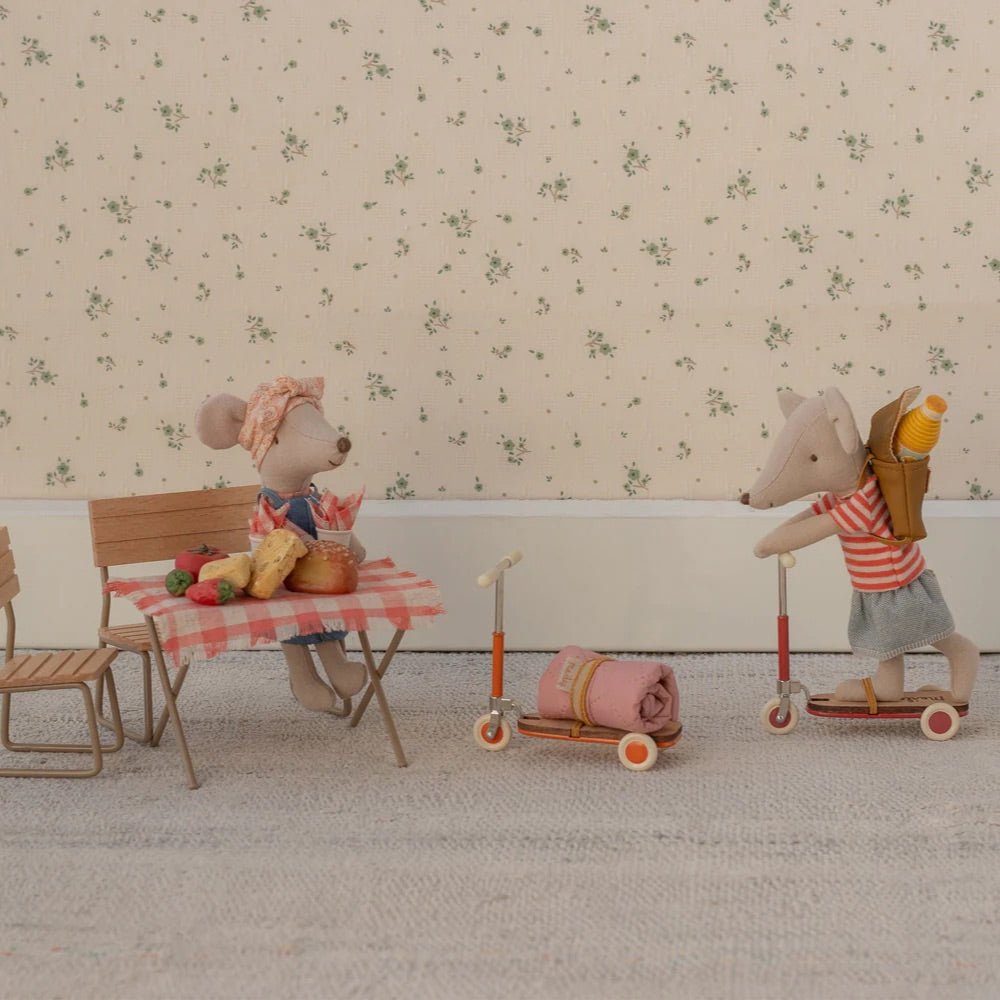 A kickboard with wooden details. The kickboard has a metal stick in the handlebars that makes sure mice with magnets in hands can stay on the board. A small elastic is added on the board and will secure the feet on the board during the ride.