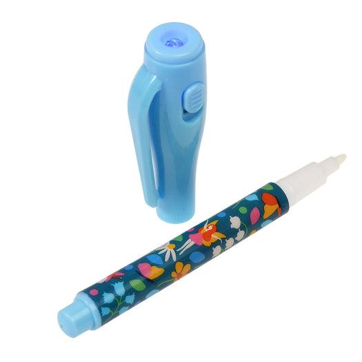 This pen, featuring our print of fairies among flowers, makes use of ink that can only be seen with UV light. Write a secret message, then shine the light in the pen lid on it to reveal it!