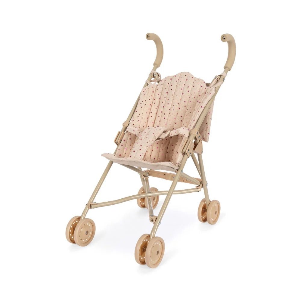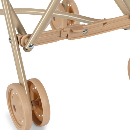 This beautiful Konges Slojd Doll stroller is a must have for any doll parent! The Doll stroller is designed with a harness, carriage bag and double wheels on all four legs for extra stability. Features removable quilted tulle fabric. Comes fully assembled. Easy to fold and store. The frame is made of iron with soft and spongy EVA material at the handles.