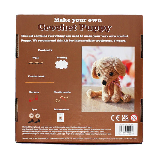 Crochet craft kit containing everything needed to make an adorable puppy dog. The perfect kit for those with some experience wishing to further develop and practise their needlecraft skills.