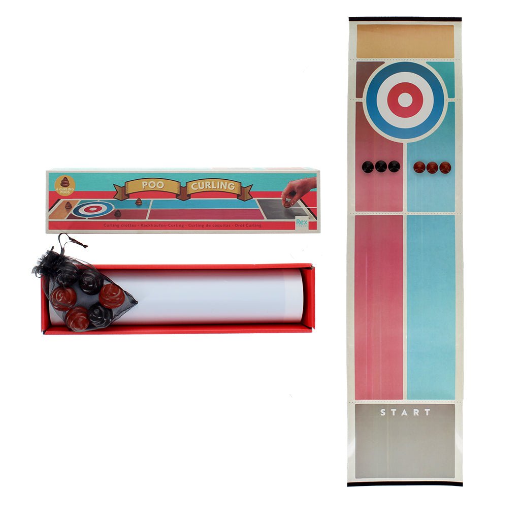 Fun and cheeky game for two players – a humourous twist on the sport of curling. With a friend or a family member, roll out the target mat on the floor or a tabletop. Take three of the six provided curling poos each, then compete to see who can slide theirs closest to the centre of the target at the end of the mat. Closest to the centre wins!