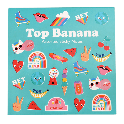 Get organised with this colourful set of Top Banana sticky paper notes in assorted sizes and covered in funky, bright and retro-style illustrations. Can be used as memo pads for to-do lists or as cute bookmarks.