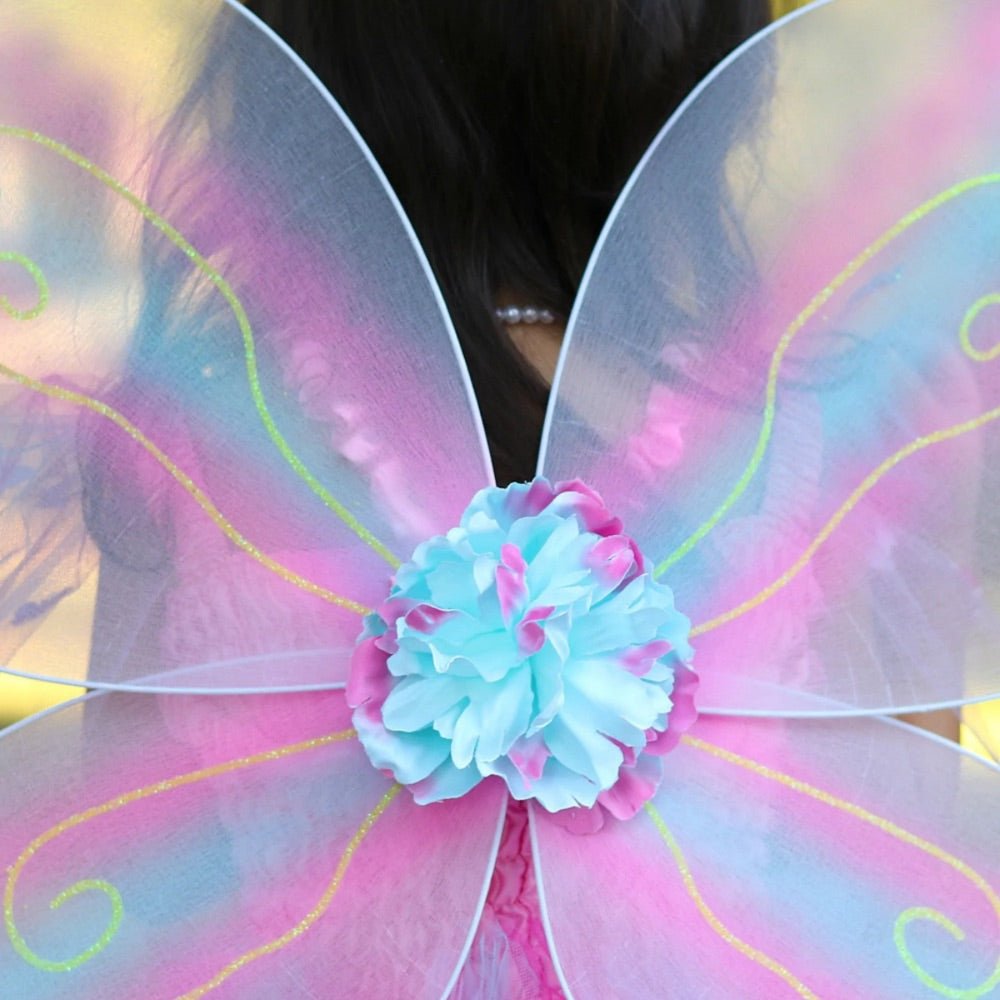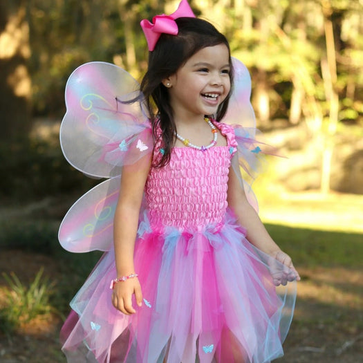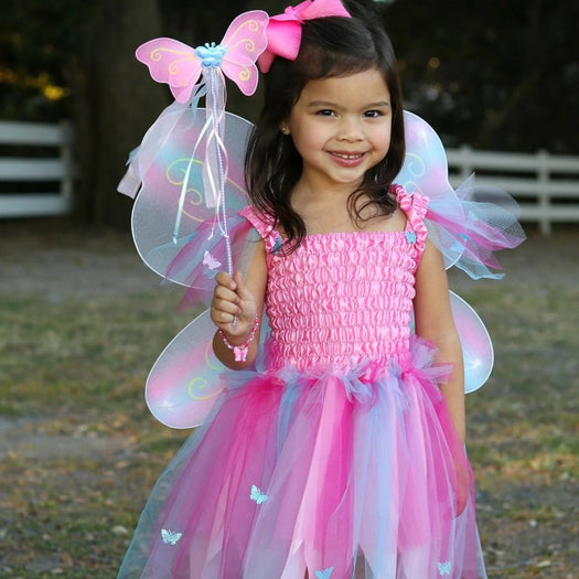 This beautiful dress, wings, and wand set will transform all little fairies to a wonderful land of fantasy and imagination. The bodice is fully ruched satin and provides comfort and size flexibility. The skirt features layers of sparkly petals adorned with iridescent butterflies and is fully lined. Adorable 4-pc wings are very comfortable to wear because they come with satin covered elasticized straps. A matching wand completes the look to work the magic!