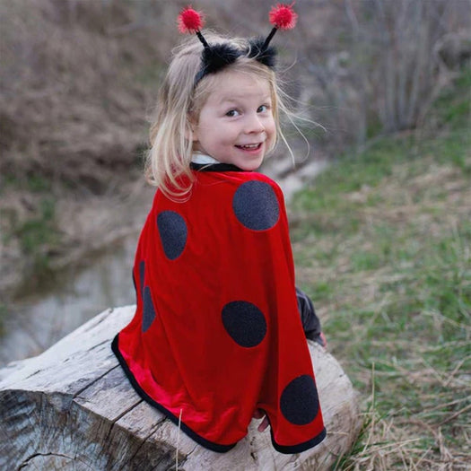 Cute Ladybug costume in red and black. The Great Pretenders costume consists of a hairband and a cloak. The hairband is black with black feathers and red feeler horns with glitter. The ladybug coat is red with large, black dots with glitter.