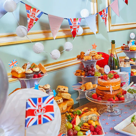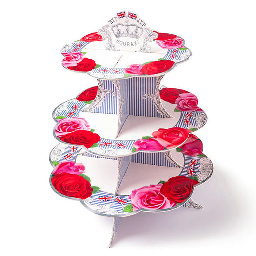 With three tiers and an elegant design of stripes, English roses and Union Jacks, this stand makes a striking centrepiece for your celebration table. At the very top, a “Hip, Hip, Hooray!” slogan and crown motif add the extra charm. Exclusively designed by Party Pieces.
