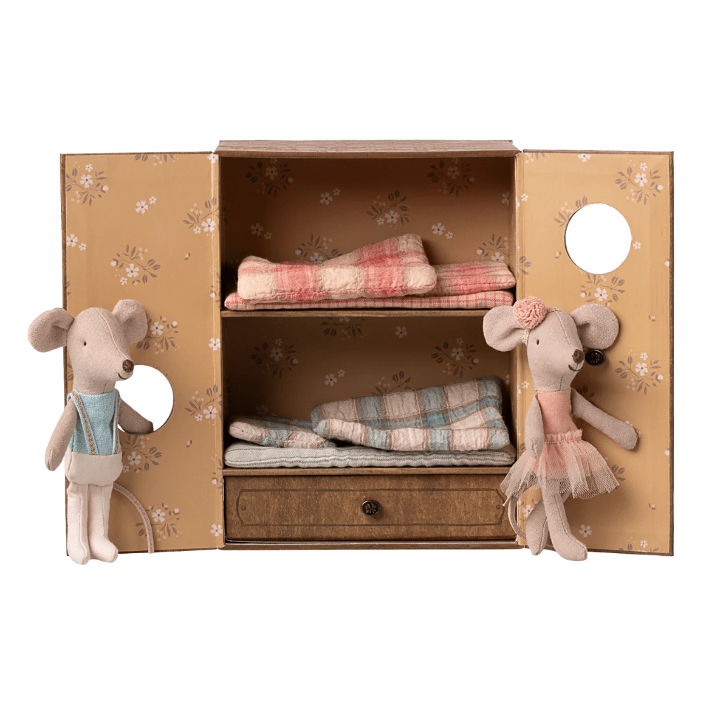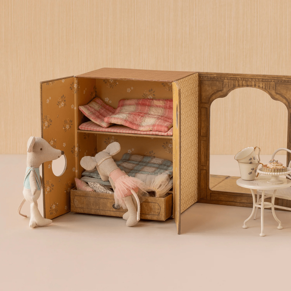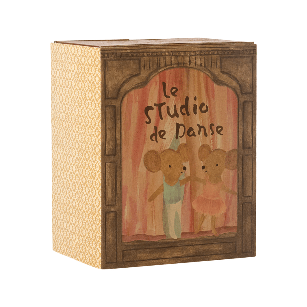 Open the doors of this magical box and explore a world of dance, stardust and storytelling. This set includes a paper box, that is both a dancestudio and a cosy mouse house, as well as two mice dressed for hours of dance in their beautiful clothes.