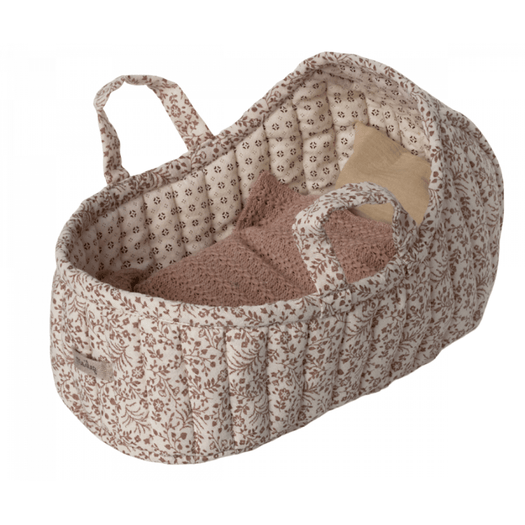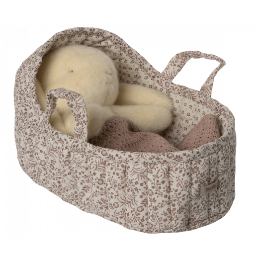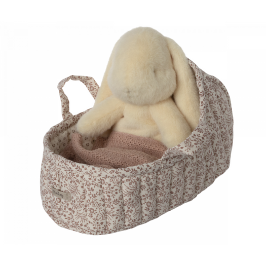 A small portable bed for your soft friends - Bunny plush and small adventurous friends fit perfectly. With this carrycot, it is easy to bring along your friend. Your friend will sleep tight with the soft pillow and under the warm knitted blanket.