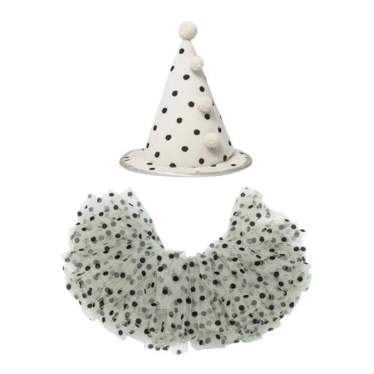 Black and cream velvet polka dot hat adorned with soft cream pom poms, secured with a velvet ribbon and popper button