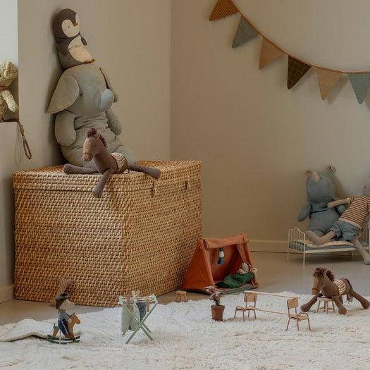 A fantastic set for hours of play. A cowboy mouse with magnets in his hands, dressed in jeans, a scarf, and a cowboy hat, rides on his rocking horse. Notice the small tail hole on the horse—a detail for the observant consumer.