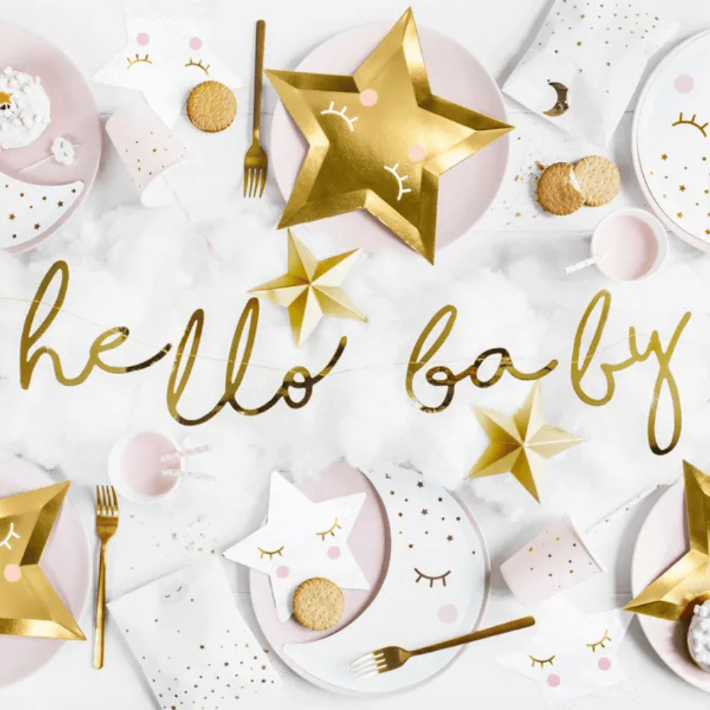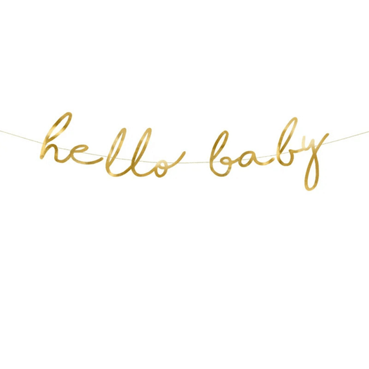 Sewn banner with wording 'Hello Baby'. Made of mirror paper in gold.