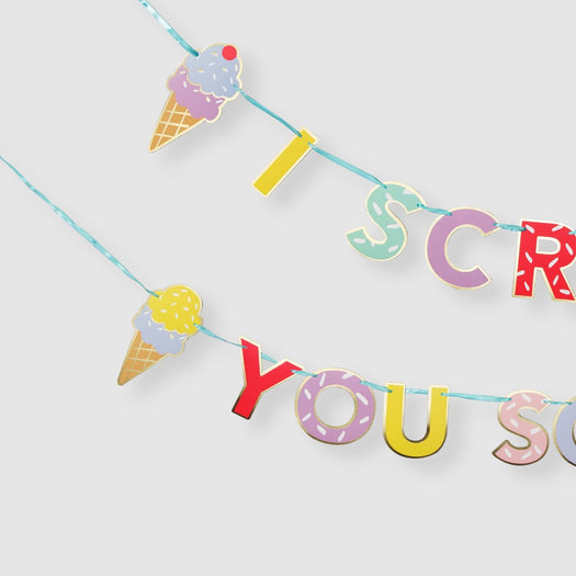 Celebrate your summer birthday with this I Scream You Scream Banner! This ice cream garland features cardstock cutouts of colorful ice cream cones and the words I SCREAM YOU SCREAM all strung together with a mint green ribbon. The letters and ice cream cutouts are outlined in gold foil detail for an elegant touch to your ice cream party. Hang this banner up on the walls, stair railing, or anywhere else in the house to decorate your ice cream social!