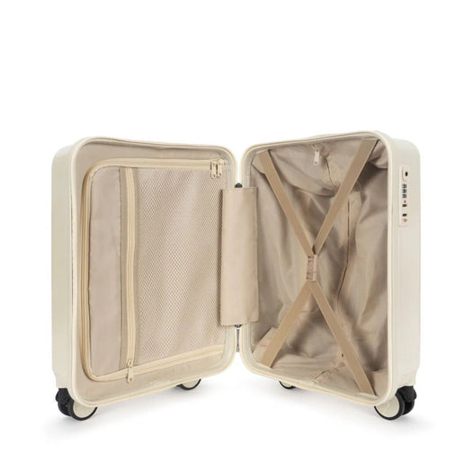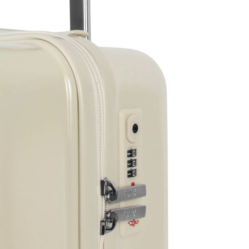 Cabin size lightweight carry-on luggage made with a hard shell, four double 360-degree spinner wheels and an approved built-in coded TSA LOCK® Features a practical top handle and an adjustable aluminium 3-step telescoping handle.