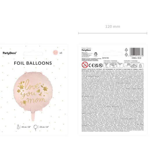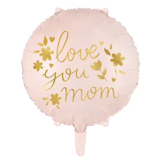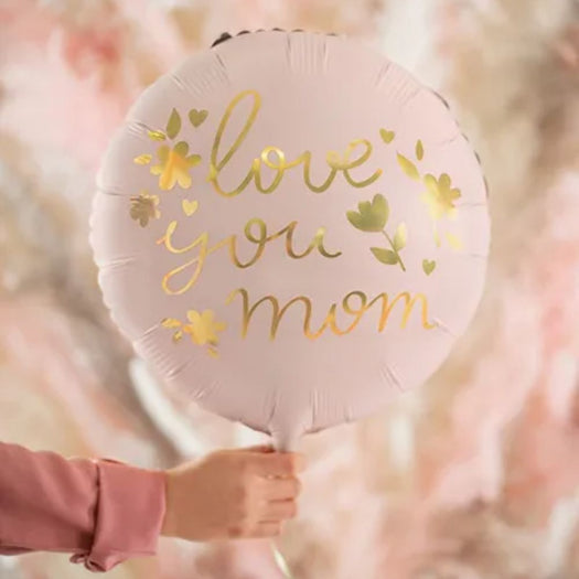 Round foil balloon in pink colour with inscription ''Love you mom'' in gold
