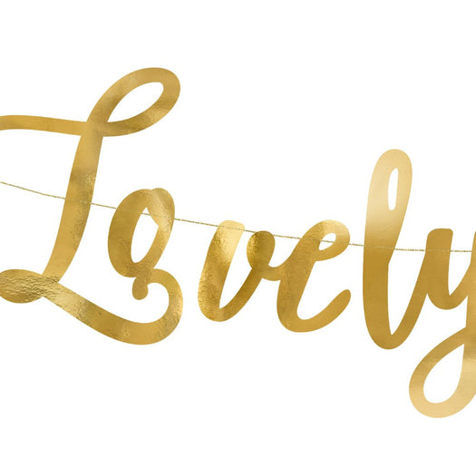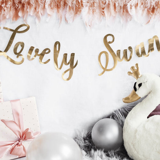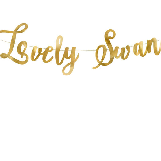 Sewn banner with words 'Lovely Swan', made of mirror gold paper.