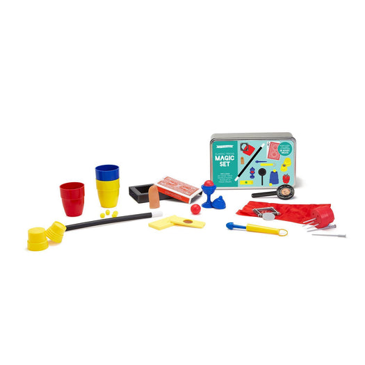 Magic kit includes: Magic Wand, Magic Cups and Ball, Magic Nail Box, Magic Spring, Coin Paddle, Fake Thumb, Magic Coin Tray, Magic Coin Case, Vanish Coin Stand, Plastic Vase and Ball, Magic Card Case with Magic Deck of Cards.Comes with a magic booklet with 20 different tricks to learn from.Games come packed inside reusable tin box