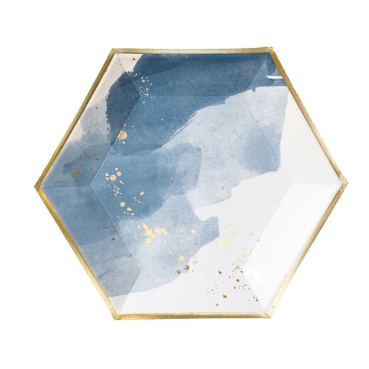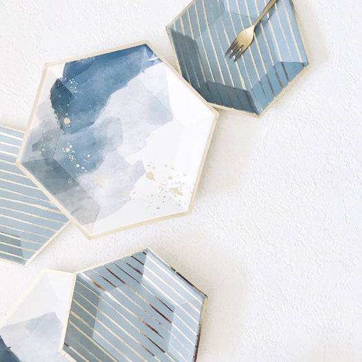 Painterly blue watercolor inspired by California waves at dusk, our large hexagon paper plate adorned with gold splashes is perfect for a relaxed gathering or an elegant celebration. Great for outdoor receptions, showers, birthdays, anniversaries, holidays and more.