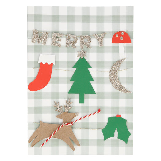 Is it a card, is it a garland? It's both! Simply remove the beautifully designed and crafted garland, with festive icons and glitter details, from the card and hang it up. There is another separate garland too, with a "Merry Christmas" message, so double the decorative effect!