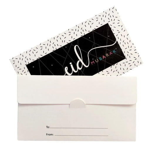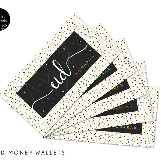 Eid Mubarak money wallets from our brand new 'Eid Edit' collection. Gift family and friends their Eidi (eid money) in these elegant Eid money envelopes making a great alternative to Eid presents. The wallets are secured by folding the flap over into a tab. There is provision to write the recipient and senders name on the back of the wallet.