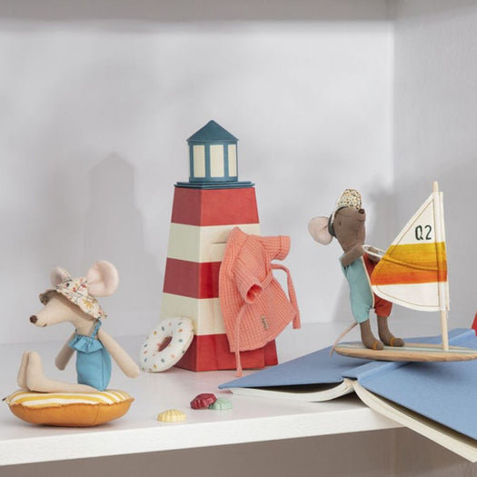 This soft bathrobe is essential after a warm bath and to bring to the beach. It fits mice size, mum and dad.