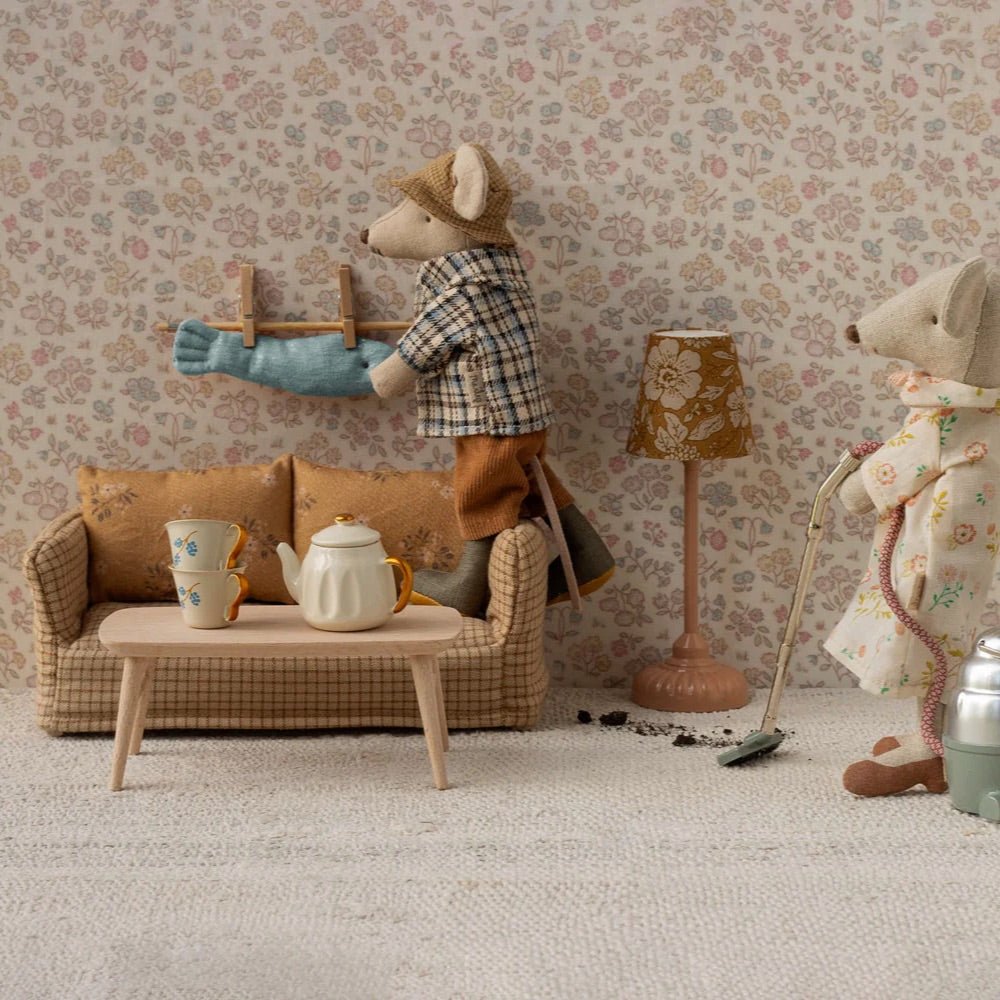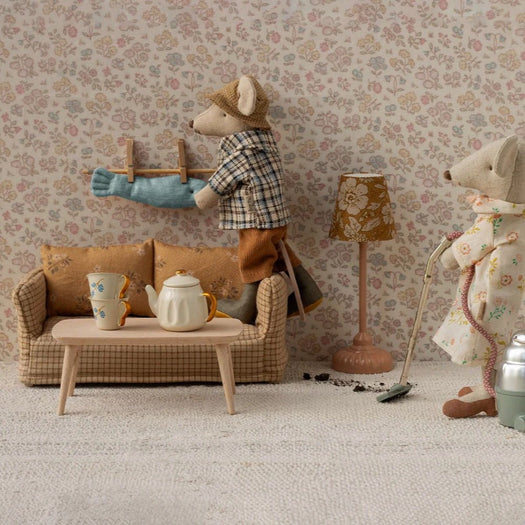 All families needs a soft couch to rest in. The mice family can all sit tight in this and have a cosy time, it fits perfectly to the living room in the Mouse hole Farmhouse. Add the wooden coffee table to fulfil your home decoration.