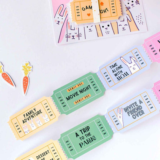 Tickets Included: Family adventure, Admit one: Movie night, Time alone with mom, Wild Card, Game night, Time alone with dad, spend $5 at the store, Dessert of choice, A trip to the park, Invite a friend over, + 2 blank coupons.