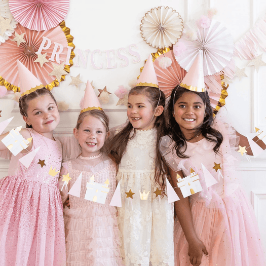 Create a magical fairy tale for your princess with this whimsical icon banner. This banner includes story book icons with gold foil accents that will transform any space into magical kingdom fit for your princess. Perfect for princess themed birthday parties or to decorate your little girl's room.