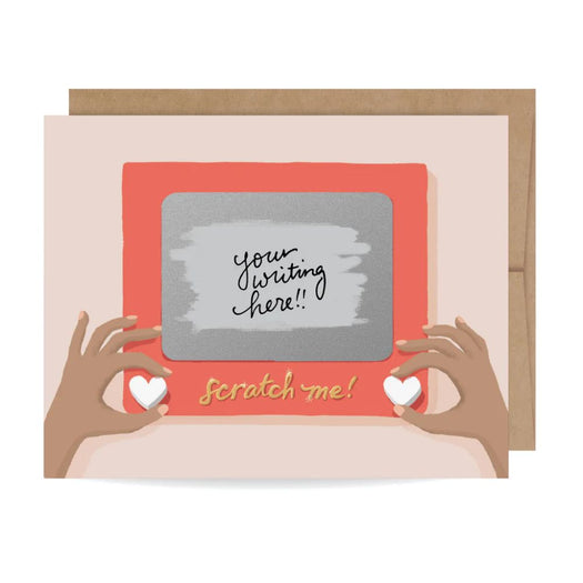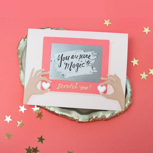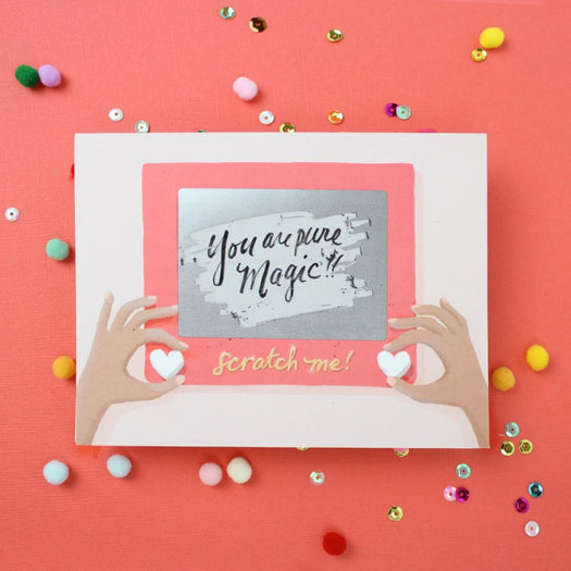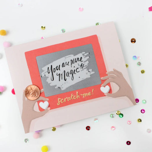 Hide your own secret message under the magical scratch-off screen! Simply write your message in the space provided and cover it with the sticker (included). Scratching with a penny will reveal your surprise handwritten message! This card is a fun and whimsical way to send an "IOU" gift in the mail for birthdays, or everyday!