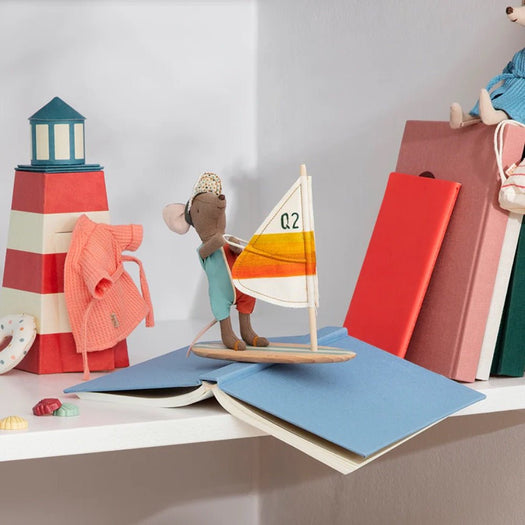Vacation time. This mouse is ready for a day at the beach. He is dressed in a surf suit and brings his surfboard, and to complete the surfer look, he wears his sunshade cap - he is ready to ride the waves! The surfboard and mast are made of wood.
