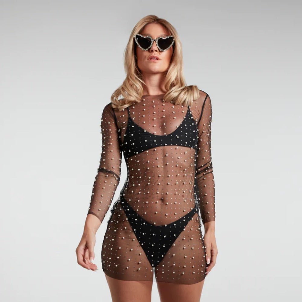 Our Emily Cover-Up is a beautiful black sheer long sleeve dress adorned with pearl detailing, and she is the perfect accessory to take you from beach babe to bridal goddess.