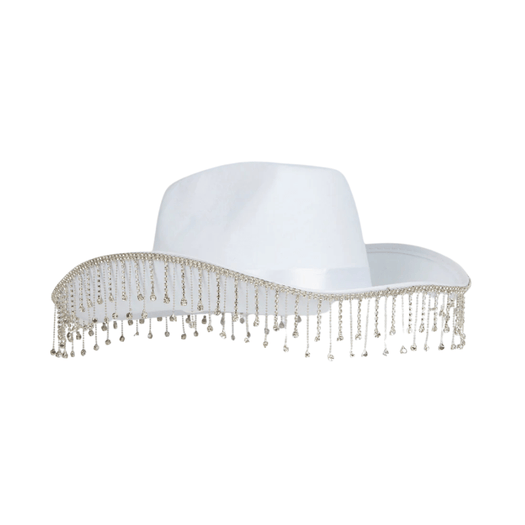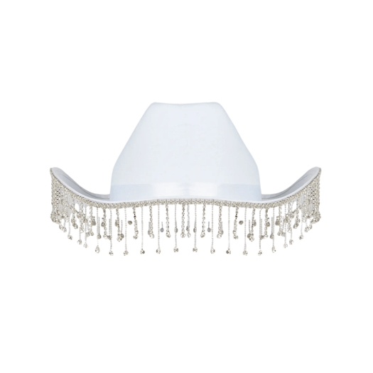 White, classic and with a dropped diamante hem, this hat gives all the sass, so showcase your wild side and embrace your inner cowgirl because tonight, it's all about you!!!