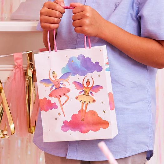 Spoil your guests with these delightful paper treat bags that feature a whimsical unicorn design on the front and a fairy princess on the reverse, in pink and pastel colours, with luxury gold foil details and elegant pink raffia twine handles. Pack them with little surprises from our party bag fillers collection and a slice of wrapped up birthday cake to enjoy at home after the celebration, or simply use to decorate the party table! Each pack includes 6 party bags that have been designed exclusively by Party Pieces, enough for a small kids’ party.