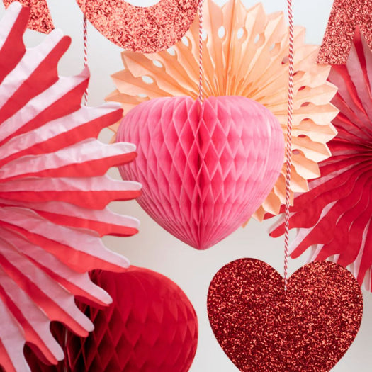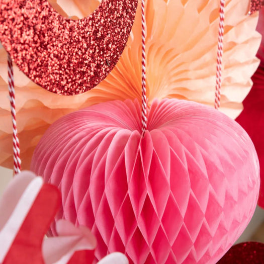 5 Honeycomb tissue paper hearts - 2 red and 3 pink
